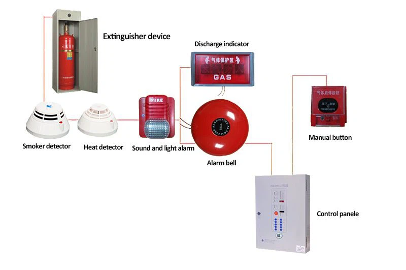 4. Control System: Control panel, smoke and heat detector, fire alarm, discharge indicator light, etc.